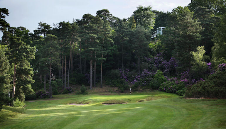 The final hole on the Green 9; this hole sums up the Green course perfectly - short and very tight!. From either tee, the tee shot requires total precision down a chute of pines to the uphill fairway. Left or right of the fairway from the tee and a provisional ball could well be required. The shot to the green is over a small brow and a valley in front of the green. Anything not making the green will stay in the rough covered valley or in one of the bunkers surrounding the green. The putting surface itself slopes from back to front and has three tiers in it making putting back down the green very fast indeed. Once on the green, any ball above the pin leaves a difficult fast putt; get on the wrong level and you will be surprised by the amount of borrow you have to take to complete your round on this fascinating 9 holes.
